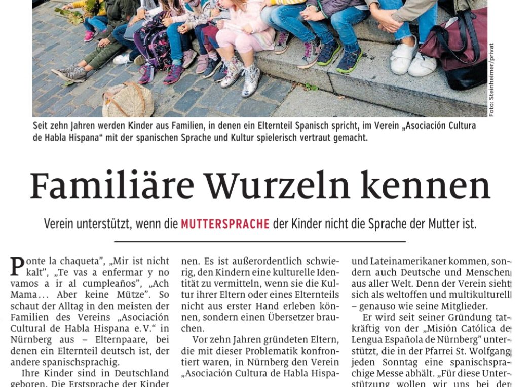 Y seguimos avanzando… dando a conocer nuestra labor a nuestra comunidad y público en general a través de estos 10 años de fundación. Labor que tiene como función principal fomentar el aprendizaje del español como lengua materna, junto con sus tradiciones culturales; así como promover la multicultiralidad en nuestros niños. Compartimos aquí el artículo publicado por el diario Nürnberger Nachrichten el 19.12.2019 — Información transmitida por nuestra Consejera Pedagógica María Pinto.