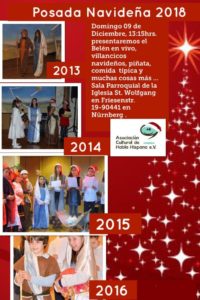 ¡Ya se respira el espíritu de la Navidad! La Asociación Cultural de Habla Hispana les invita a su tradicional Posada Navideña que tendrá lugar el 09 de diciembre de 2018 a las 13:30 hs en la sala parroquial de la iglesia St. Wolfgang en Friesenstr.19, Nürnberg. La entrada es gratuita. Habrá una representación del nacimiento de Jesús, villancicos populares, una piñata, comida típica de nuestros países de origen, mucha diversión en familia y ¡alguna sorpresa!Estaremos encantados de que muchas familias se unan a nosotros en esta época tan entrañable del año y que juntos podamos transmitir a los más pequeños de la casa nuestras tradiciones y nuestra hermosa cultura. ¡Les esperamos!